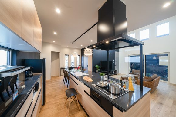 アイランド型のキッチンは黒と木目調の組み合わせがオシャレ。