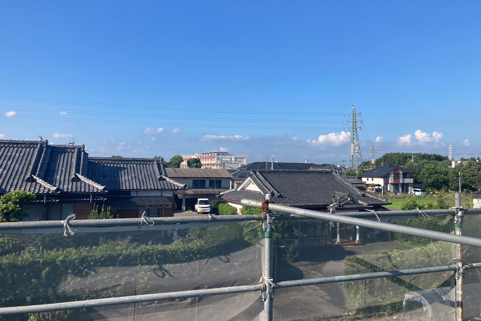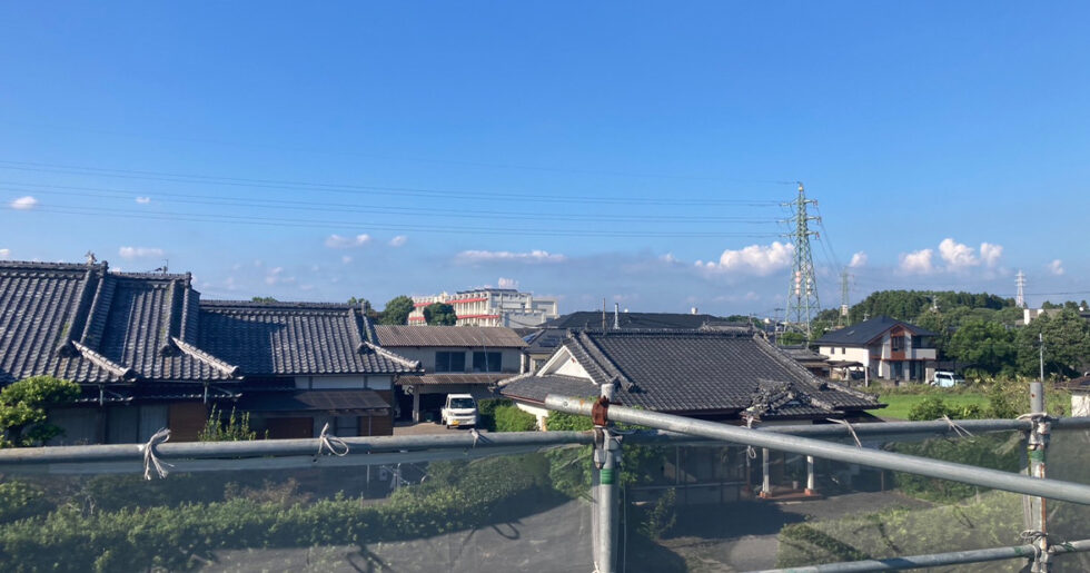 先日上棟式が行われ無事建て方工事も進んでおりその上から撮った一枚になります。