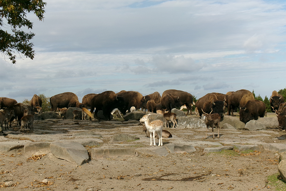 アメリカバイソンの大群の中に