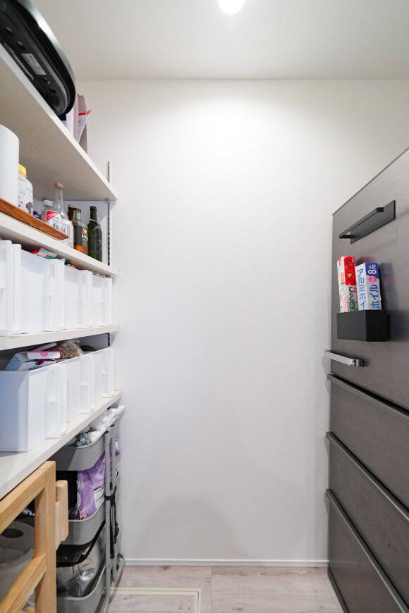 ノイズレスなキッチン空間に仕上げられるよう、パントリーは大型家電や食料がスッキリ収まるサイズでお造りしております。