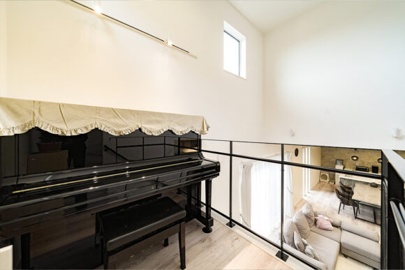音の広がりをダイレクトに感じられるよう、ピアノはステージのようなスキップフロアに!