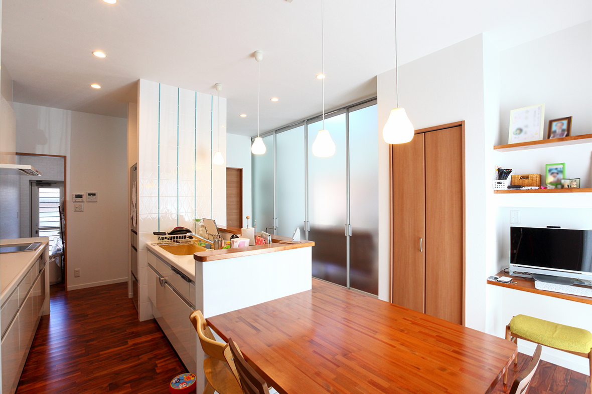 ちょっとしたPCスペースも配置しているダイニングキッチン。来客があってもパーテーションを閉めれば気になりません